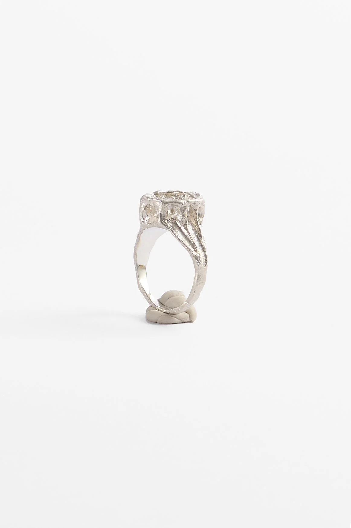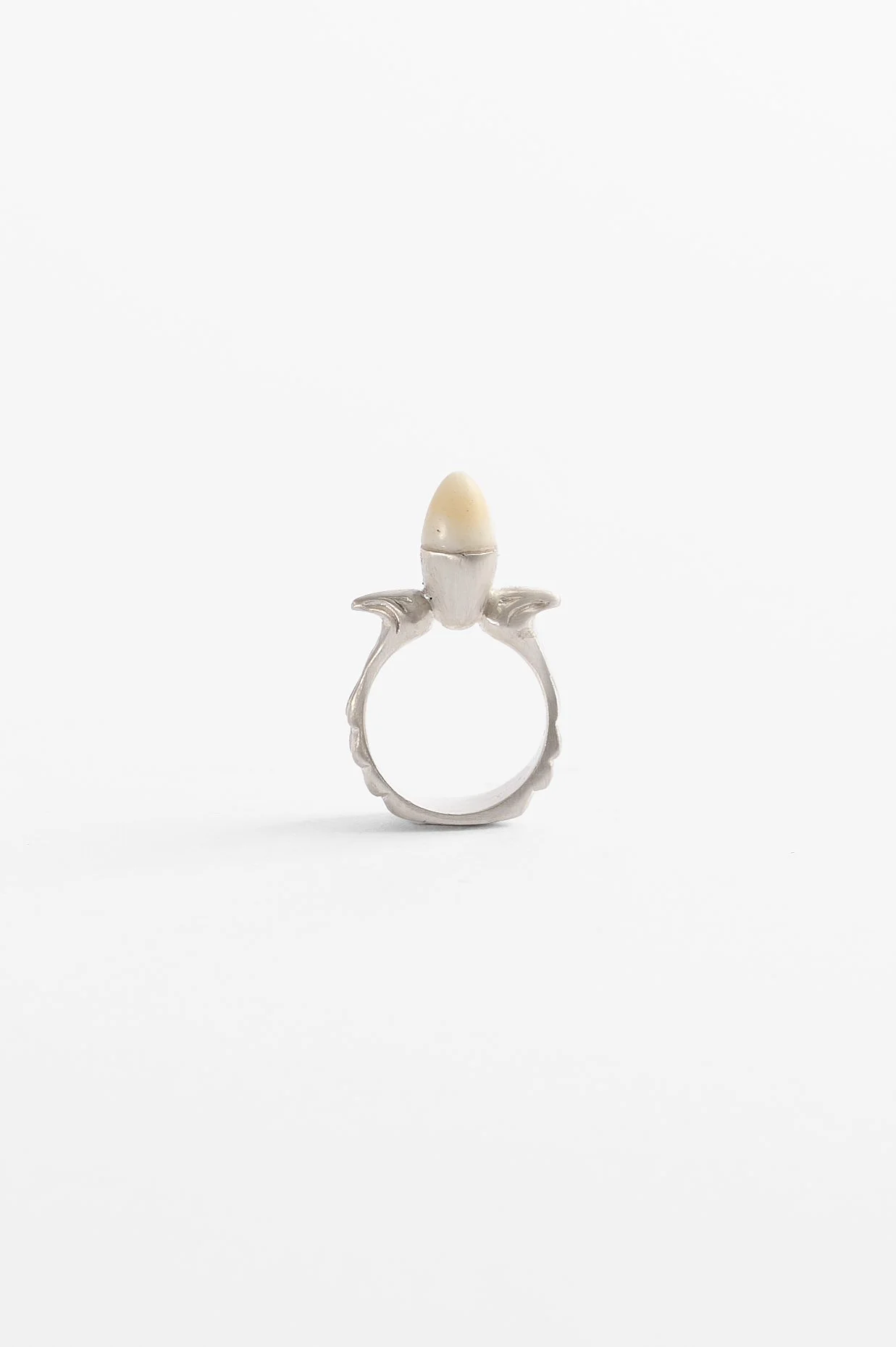Emily O’Brien (13) 3. ‘Plinth Ring – Creation’, sterling silver, carved bone, approx. size M, 34 x 21 x 8mm, 2025. Photography: Ross Coulter